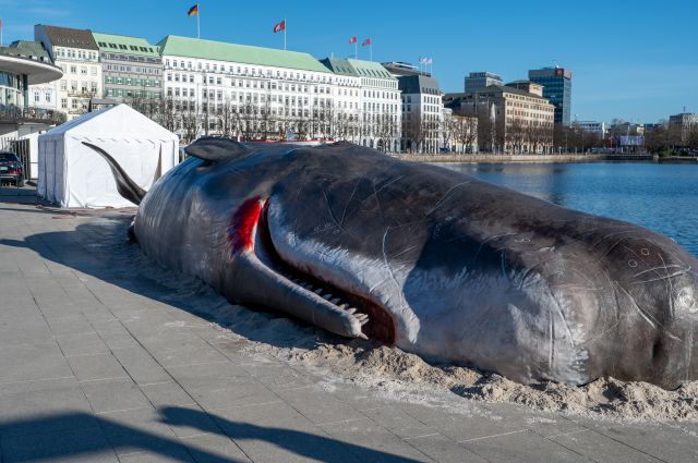 Ein ungewöhnlicher Anblick bietet der Hamburger Jungfernstieg am Donnerstagmorgen (03.04.2025): Direkt an der Binnenalster liegt eine künstliche Nachbildung eines rund 15 Meter langen Wals.