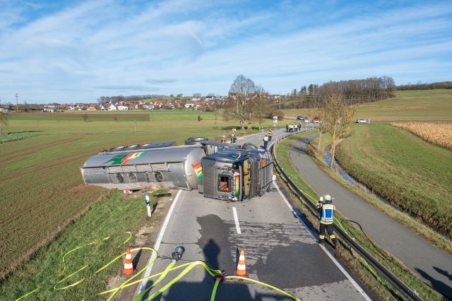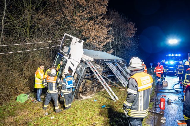 Redaktioneller Hinweis: Firmenaufschrift des Lastwagens bitte pixeln!Zwischen Unterstürmig und Eggolsheim (Lkr.: Forchheim) kam am Montag (16.01.2023) ein Laster rechts von der Fahrbahn ab, kippte... mehr...