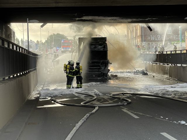 Einsatz für die Feuerwehr am Montagmorgen (08.08.2022) in der Zweibrückenstraße in Hamburg. Dort ist ein Laster unter einer Bahnbrücke nahe der S-Bahn Haltestelle "Elbbrücken" in Flammen... mehr...