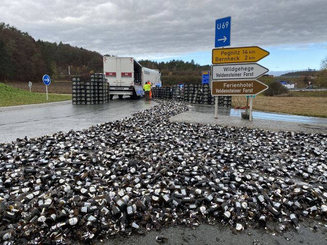 Seine komplette Ladung Bier verlor ein Lastwagenfahrer am Donnerstag (19.11.2020) auf der Staatsstraße 2163 bei Plech im Landkreis Bayreuth. Beim befahren des Kreisverkehrs öffnete sich die... mehr...