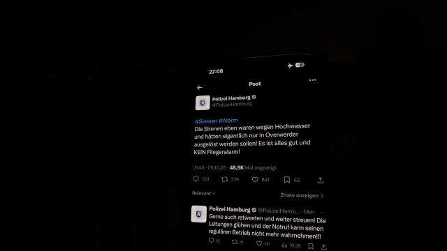 Am späten Sonntagabend (05.10.2025) gingen plötzlich die Sirenen in Hamburg los. Offenbar gingen zahlreiche Einwohner der Hansestadt deshalb von einem Fliegeralarm aus, sah sich doch die Polizei zu ... mehr...