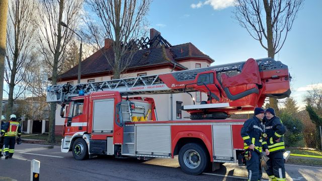 Am Dienstag (17.01.2023) kam es in Halle (Saale)(Lkr.: Saalekreis) gegen acht Uhr in der Früh zu einem Brand in einer Doppelhaushälfte. Laut ersten Informationen konnten sich die Bewohner rechtzeitig ins Freie begeben. Verletzt wurde keiner. Die Feuerwehr ist mit einem Großaufgebot vor Ort und konnte den Brand löschen. Der Dachstuhl des Hauses wurde dabei massiv beschädigt, sodass beide Haushälften derzeit nicht bewohnbar sind. Die Brandursache ist noch unklar. Ein Brandursachenermittler ist bereits ebenfalls vor Ort.