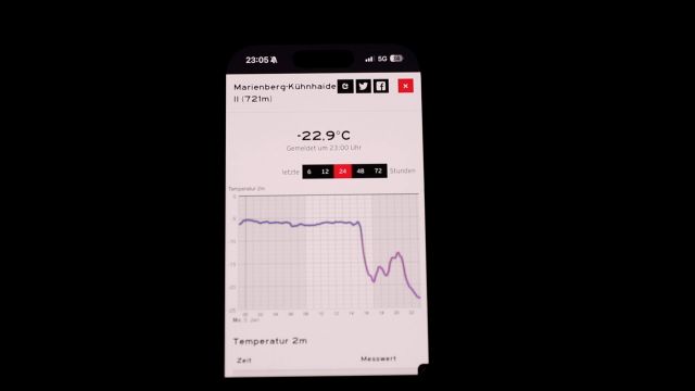Nach den Schneefällen der vergangenen Tage hat nun klirrende Kälte das Erzgebirge fest im Griff. Am Montagabend (05.01.2026) klarte der Himmel über der Region auf, in der Folge sackten die Temperaturen deutlich ab. In Marienberg-Kühnhaide wurden in der Nacht zum Dienstag gegen 23 Uhr bis zu minus 23 Grad Lufttemperatur gemessen. In Bodennähe lagen die Werte sogar bei rund minus 27 Grad.