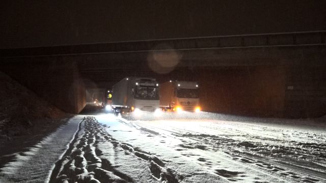 Die Fahrbahn der Auffahrt hat sich durch den anhaltenden Schneefall der vergangenen Stunden in eine gefährliche Rutschbahn verwandelt. Mehrere LKW-Fahrer versuchten trotzdem, die Anhöhe zur Autobahn zu erklimmen – vergeblich. Reifen drehen durch, Fahrzeuge rutschen zurück, teilweise quer über die Fahrbahn. Schließlich bleibt für viele nur ein Ausweg: Halt unter einer Autobahnbrücke. Dort stauen sich die Lastwagen, der Verkehr kommt nahezu zum Erliegen. Auch auf einer Auffahrt auf die A9 blieb ein Lkw zeitweise stecken. Hier unterstützte ein polnischer Kollege mit einer Anti-Rutsch-Matte einen Lkw-Fahrer und konnte so für Haftung der Reifen sorgen..